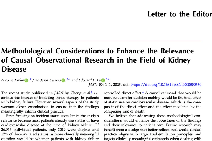 Methodological Considerations to Enhance the Relevance of Causal Observational Research in the Field of Kidney DiseaseSat February 1, 2025·Antoine Créon,Juan-Jesus Carrero,Edouard L. Fu Cite DOILast updated on Sat February 1, 2025 AuthorsAntoine CréonMD - Nephrologist and PhD Student in Epidemiology and Biostatistics ← Metformin in People With Diabetes and Advanced CKD: Should We Dare? Sat February 1, 2025Serological responses against seasonal influenza viruses in patients with multiple myeloma treated or untreated with daratumumab after two doses of tetravalent vaccine Wed May 1, 2024 →