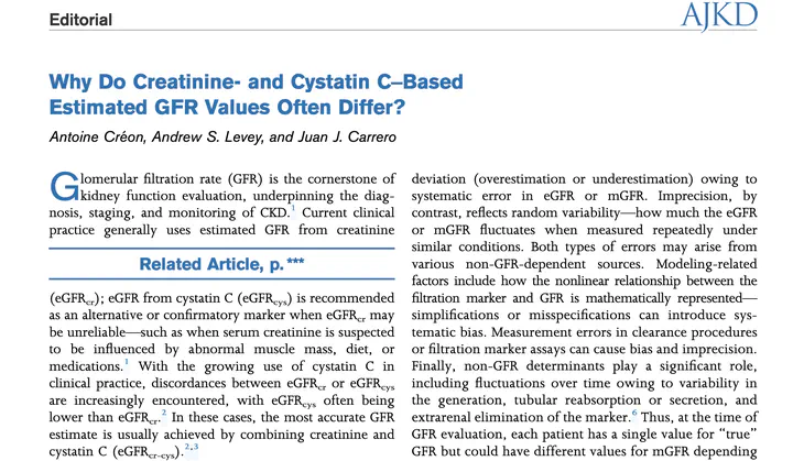 Why Do Creatinine- and Cystatin C-Based Estimated GFR Values Often Differ?Sun June 1, 2025·Antoine Créon,Andrew S. Levey,Juan-Jesus Carrero Cite DOILast updated on Sun June 1, 2025 AuthorsAntoine CréonMD - Nephrologist and PhD Student in Epidemiology and Biostatistics ← Risk-based referral model to nephrologist-specialist care in Stockholm Tue July 1, 2025Metformin in People With Diabetes and Advanced CKD: Should We Dare? Sat February 1, 2025 →