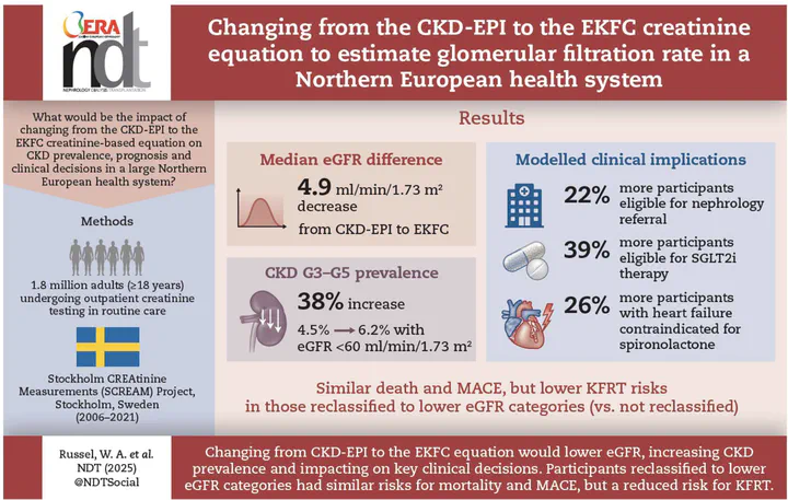 The European Kidney Function Consortium (EKFC) 2021 equation to estimate GFR performs as well or better than the CKD-EPI 2009 equation in predominantly white adult European populations, with less bias and greater accuracy against measured GFR. This study explores how changing from the CKD-EPI to the EKFC equation in a large European health system may impact disease distribution, prognosis and clinical decisions.
